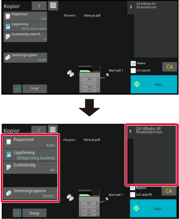 Inställningarna lagras i maskinen och aktiveras.Du kan lägga till snabbknappar på startskärmen och radera snabbknappar som inte behövs.