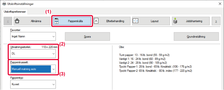 När [Utmatningsstorlek] är inställt på kuvert ställs [Papperstyp] automatiskt in på