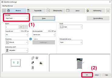 Inställningar kan sparas via flikarna i skrivardrivrutinens egenskapsfönster. De konfigurerade
