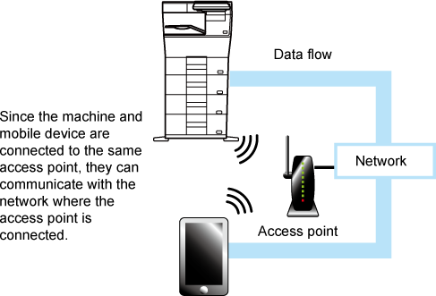 Makine ve mobil cihaz, bir erişim noktasının kurulu olduğu ağ üzerinden iletişim kurabilir.
