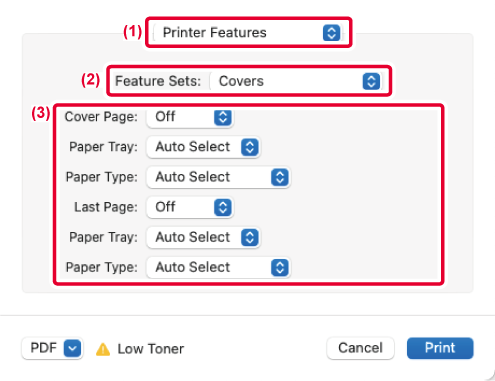odpovídajících nabídkách zvolte pozici vkládání, zdroj papíru a způsob
