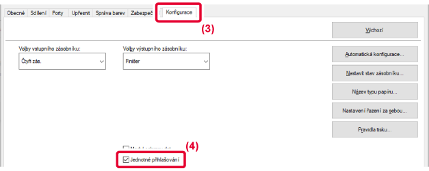 V zařízení je nutno předem zapnout službu Active Directory. Informace o službě Active Directory najdete v části " FUNKCE PROPOJENÍ SLUŽBY ACTIVE DIRECTORY". Po zapnutí služby Active Directory proveďte nastavení níže v ovladači tiskárny.