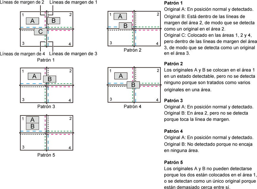 Si escanea los originales con el alimentador de documentos automático cerrado, no será posible detectar los bordes de los originales y no se podrá escanear correctamente. Utilice esta función siempre con el alimentador de documentos automático abierto. Si una fuente de luz, como luz eléctrica, brilla sobre los originales durante el escaneado, el recortado podría no realizarse correctamente. Ajuste el ángulo del alimentador de documentos automático para que la fuente de luz no afecte a la imagen.Precaución