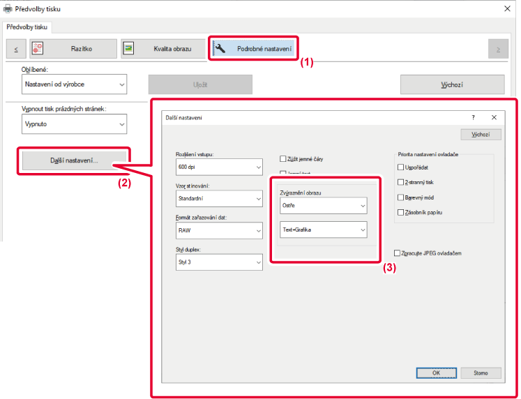 Okraje textu a grafiky můžete vyhladit a zaostřit. Auto: Provede optimální vylepšení obrazu. Vypnuto: Nepoužije se vylepšení obrazu. Ostré: Použije se ostré vylepšení obrazu. |