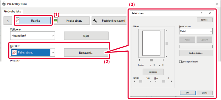 Tato funkce vytiskne často používaný obraz nebo ikonu vytvořenou vámi, jako by byla vyznačena razítkem na tisková data. U obrazu je možno nastavit jeho velikost, umístění a úhel.