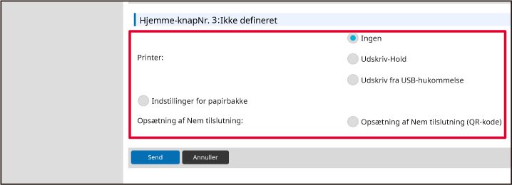 Ved nogle indstillinger kan det kræves, at du indtaster din brugeradgangskode, efter at du har klikket på [Indstilling for forside]. Hvis du ikke har udført brugergodkendelse, skal du indtaste administratoradgangskoden.