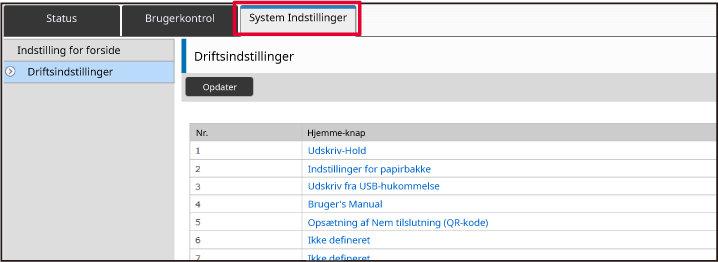 I standard fabrikstilstand skal du indtaste din brugeradgangskode efter indtastning af IP-adressen.På websiden skal du klikke på fanen [Systemindstillinger] → [Indstilling for forside].