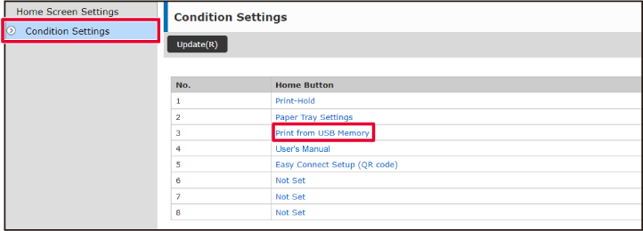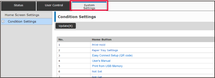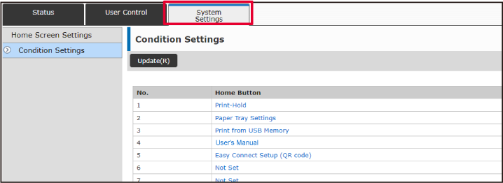 In the factory default state, you must enter your user password after entering the IP address.On the Web page, click the [System Settings] tab → [Home Screen Settings].