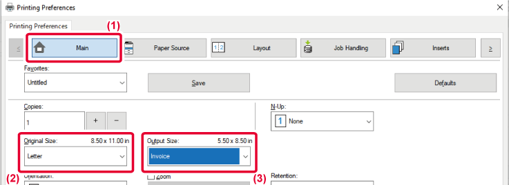 3. Select the actual paper size to be used for printing from [Output Size] (for example: Invoice).