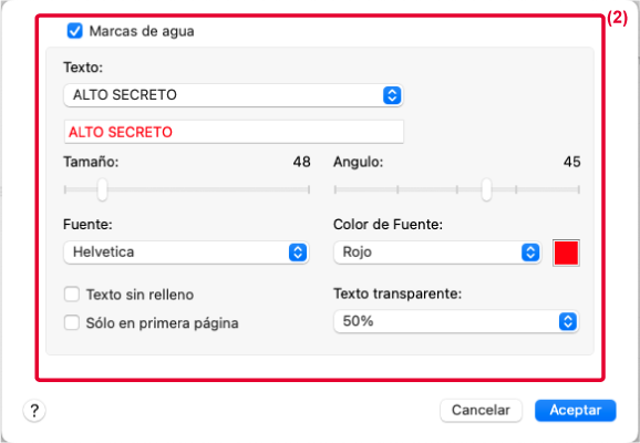 3. Haga clic en la casilla de verificación [Marcas de agua] y configure las opciones de la marca de agua.