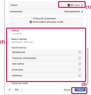 • Näyttöjen ja menettelyjen selitykset, jotka on tarkoitettu käytettäväksi macOS-ympäristössä, olettavat yleensä, että käytetään macOS 14 -versiota ja PPD-ohjain on asennettu. Näytöt voivat olla erilaisia käyttöjärjestelmän tai ohjelmistosovelluksen version mukaan.