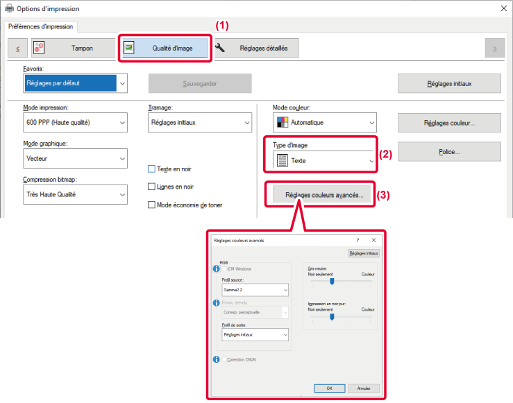 gestion des couleurs, sélectionnez les réglages de votre choix dans