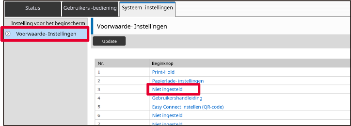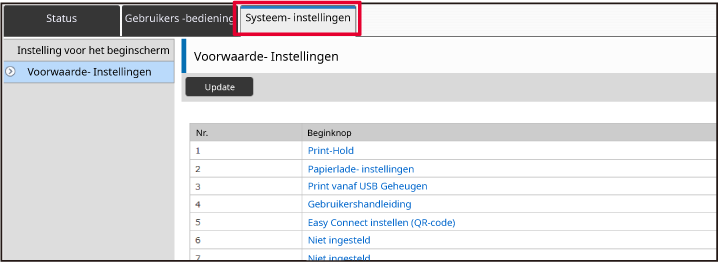 Wanneer de standaard fabrieksinstellingen zijn ingesteld, moet u uw wachtwoord invoeren nadat u het IP-adres heeft ingevoerd.Klik op de webpagina op de tab [Systeeminstellingen] → [Instelling voor het beginscherm].