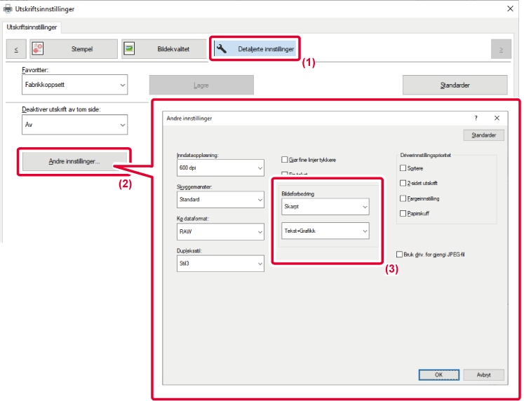 Du kan gjøre kantene på tekst og grafikk mykere eller skarpere. Auto: Utfør optimal bildeforbedring. Av: Ingen bildeforbedring. Skarp: Bildeforbedringen er skarp. |
