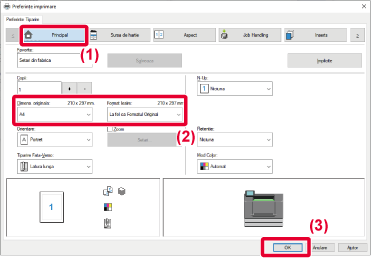 imprimată. Setările de finisare și modul color sunt indicate prin
