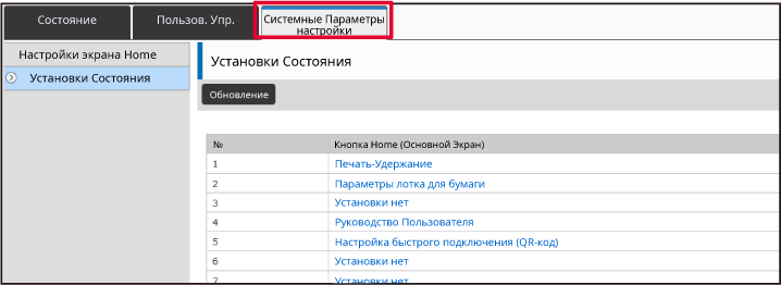 Для некоторых параметров после щелчка по пункту [Настройки экрана Home] может потребоваться ввод пароля пользователя. Если не выполнялась аутентификация пользователя, необходимо ввести пароль администратора.
