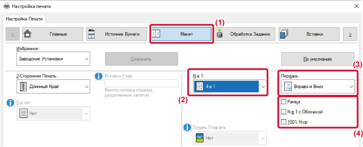 на лист) или [4 в 1] (4 странцы на лист), в зависимости от