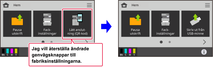 Inställningarna lagras i maskinen och aktiveras.Du kan ta bort onödiga snabbknappar.
