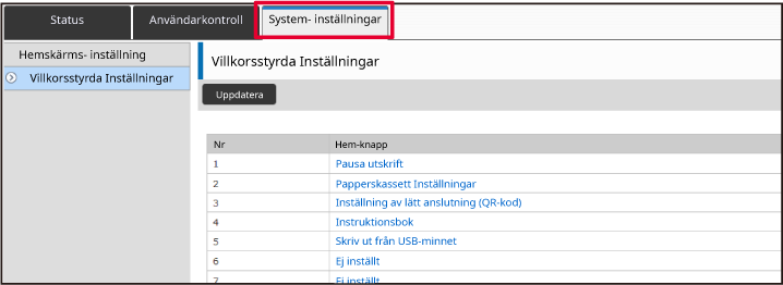 När fabriksinställningarna är aktiva måste du ange ditt användarlösenord efter det att du angett IP-adressen.Klicka på fliken [Systeminställningar] → [Hemskärms inställning] på webbsidan.