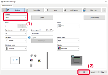 Inställningar kan sparas via flikarna i skrivardrivrutinens