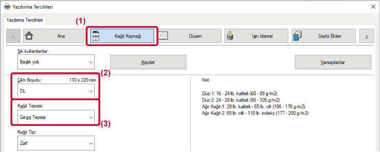işleminde kullanılacak kağıt boyutunu ve türünü ve kullanılacak