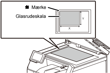 Læg originalen med forsiden nedad, og få originalens øverste venstre hjørne til at flugte med glaspladens bageste venstre hjørne (ved spidsen af mærket