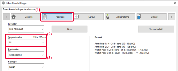 Hvis "Original størrelse" indstilles til kuvert på fanen [Generelt]