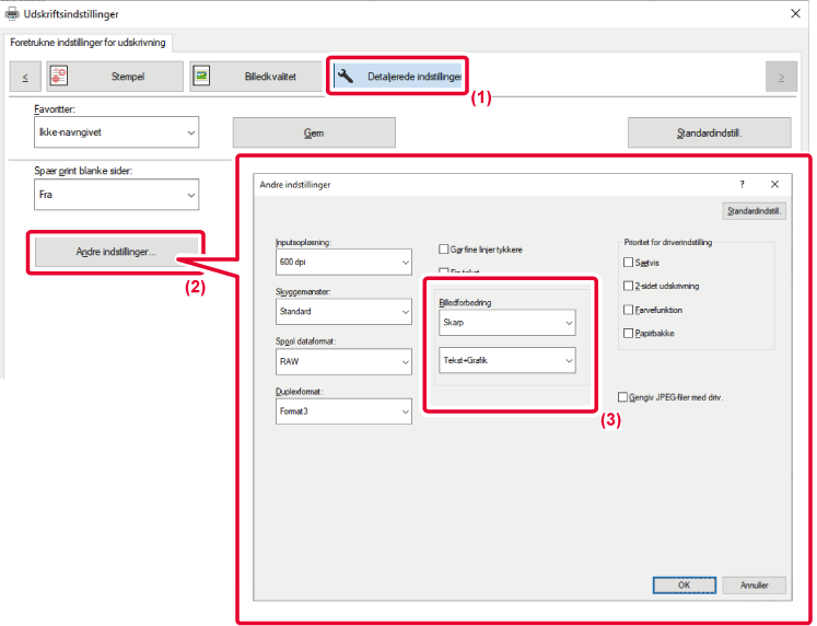 Du kan gøre kanter på tekst og grafik blødere eller skarpere. Automatisk: Udfører optimal billedforbedring. Fra: Der anvendes ingen billedforbedring. Skarp: Billedforbedring anvendes skarpt. |