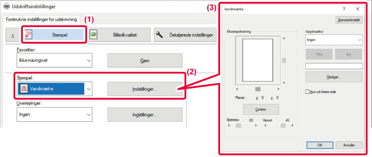- Vælg [Vandmærke] fra "Stempel" og klik på [Indstillinger].