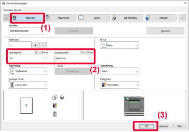 Die Einstellungen "Ausgabegröße" und "Papierfach" sind wie folgt