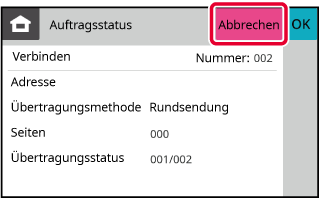Berühren Sie die Taste [Abbrechen] sobald ein Bildschirm angezeigt wird, der bestätigt, dass der Auftrag abgebrochen wurde.