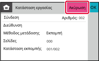 Πατήστε το πλήκτρο [Ακύρωση] όταν εμφανιστεί μια οθόνη για επιβεβαίωση της ακύρωσης της εργασίας.