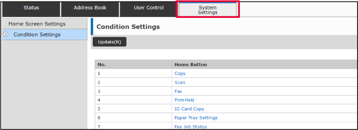 In the factory default state, you must enter your user password after entering the IP address.On the Web page, click the [System Settings] tab → [Home Screen Settings].