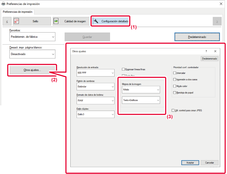 Puede suavizar o afilar los bordes del texto y los gráficos. Auto: Realizar una mejora óptima de la imagen. Off: No se aplica ninguna mejora a la imagen. Nítida: La mejora de la imagen se aplica nítidamente. |
