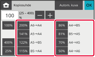Aseta alkuperäinen automaattisen syöttölaitteen asiakirjan syöttötasolle tai valotuslasille.Kosketa [Kopiosuhde]-näppäintä.