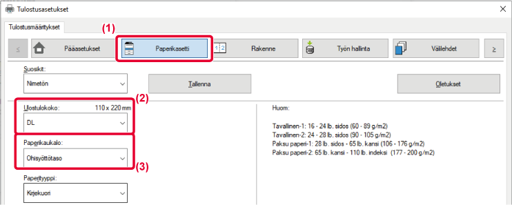 tulostamiseen käytetyn paperin koko ja tyyppi ja paperitaso.