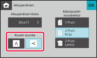 Kosketa [Alkup.]-näppäintä ja kosketa [2-Puol. Kirja]- tai [2-Puol. Lehtiö]-näppäintä.