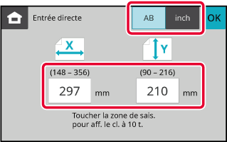Appuyez sur la touche [Saisie directe] pour saisir une valeur numérique pour le format du papier chargé. Une fois les réglages terminés, appuyez sur la touche [OK].