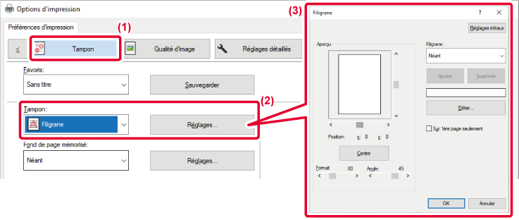 Cette fonction imprime une image ou une icône fréquemment utilisée de votre propre création, comme si elle était estampillée sur les données d'impression. Vous pouvez ajuster le format, la position et l'angle de l'image.