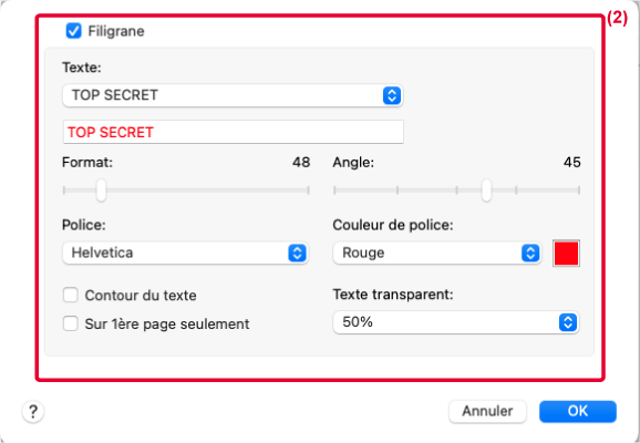Cette fonction ajoute un filigrane sous forme de texte flou dans le fond de l'image imprimée. Vous pouvez ajuster le format et l'angle du texte du filigrane.