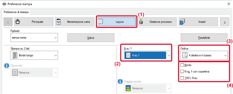per foglio) o [4 su 1] (4 pagine per foglio), a seconda dell'ordine delle