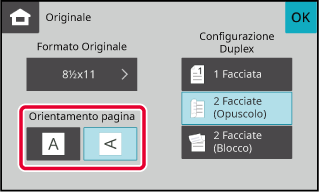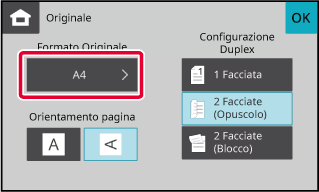 Toccare il tasto [Originale], quindi toccare il tasto [2 Facciate (Opuscolo)] o [2 Facciate (Blocco)].