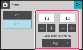 Quando in modalità fax, inserire il numero di destinazione.Toccare il tasto [Altri], quindi il tasto [Timer].