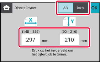 Tik op de toets [Directe Invoer] om getalswaarden in te voeren voor het formaat van het geladen papier. Wanneer u klaar bent met het invoeren van de instellingen, tikt u op de toets [OK].