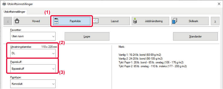 inn størrelse og type papir som skal brukes til utskriften og papirskuffen.