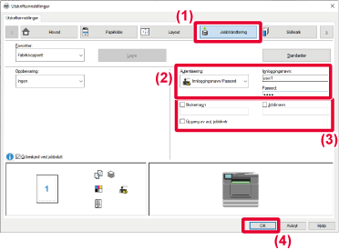 • Hvis du har konfigurert "Utskriftspolicy" på [Konfigurasjon]-fanen slik at brukerautentisering alltid utføres, må brukerne autentiseres for hver utskriftsjobb. Dette gjør du ved å angi autentiseringsinformasjonen i en dialogboks som vises hver gang det utføres utskrift.