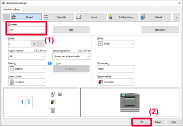 Velg maskinens skriverdriver fra programmets utskriftsvindu, og klikk på [Innstilinger]-knappen.