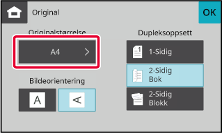 Trykk på [Original]-tasten og deretter trykker du på [2-Sidig Bok]- eller [2-Sidig Blokk]-tasten.