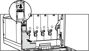 Ostrożnie naciskając hak w górnej części pojemnika na zużyty toner, wyciągnij go do siebie.