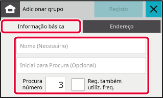 O primeiro endereço de cada tipo de endereço é definido como o endereço predefinido. Se nenhum endereço tiver a caixa de verificação junto a ele selecionada, é exibido um ecrã de confirmação perguntando se se pretende selecionar um endereço predefinido."Grupo" é utilizado para selecionar e registar